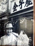 店頭に飾ってある写真、映画「男はつらいよ」の封切当初、昭和40年代の写真です。シルエットを型どった寅さん煎餅。現在も販売しています。